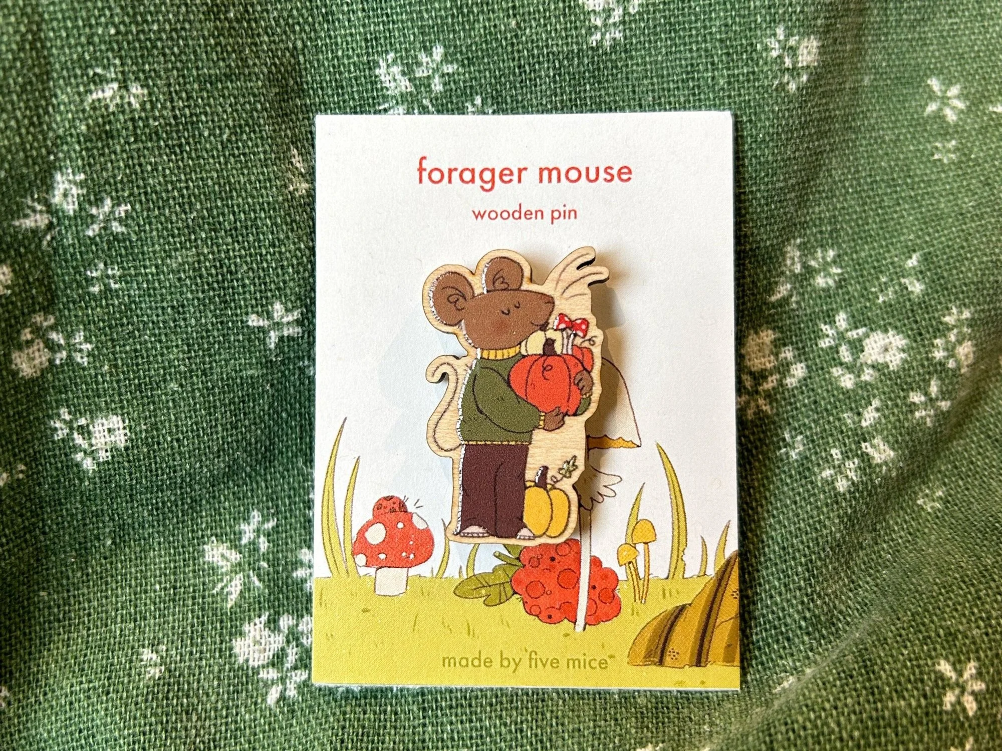 Forager Mouse Pins!I illustrated these pins based on my illustration “Autumn Flowers” . They’re made from 100% recycled maple wood.Soon to be available on my Etsy!