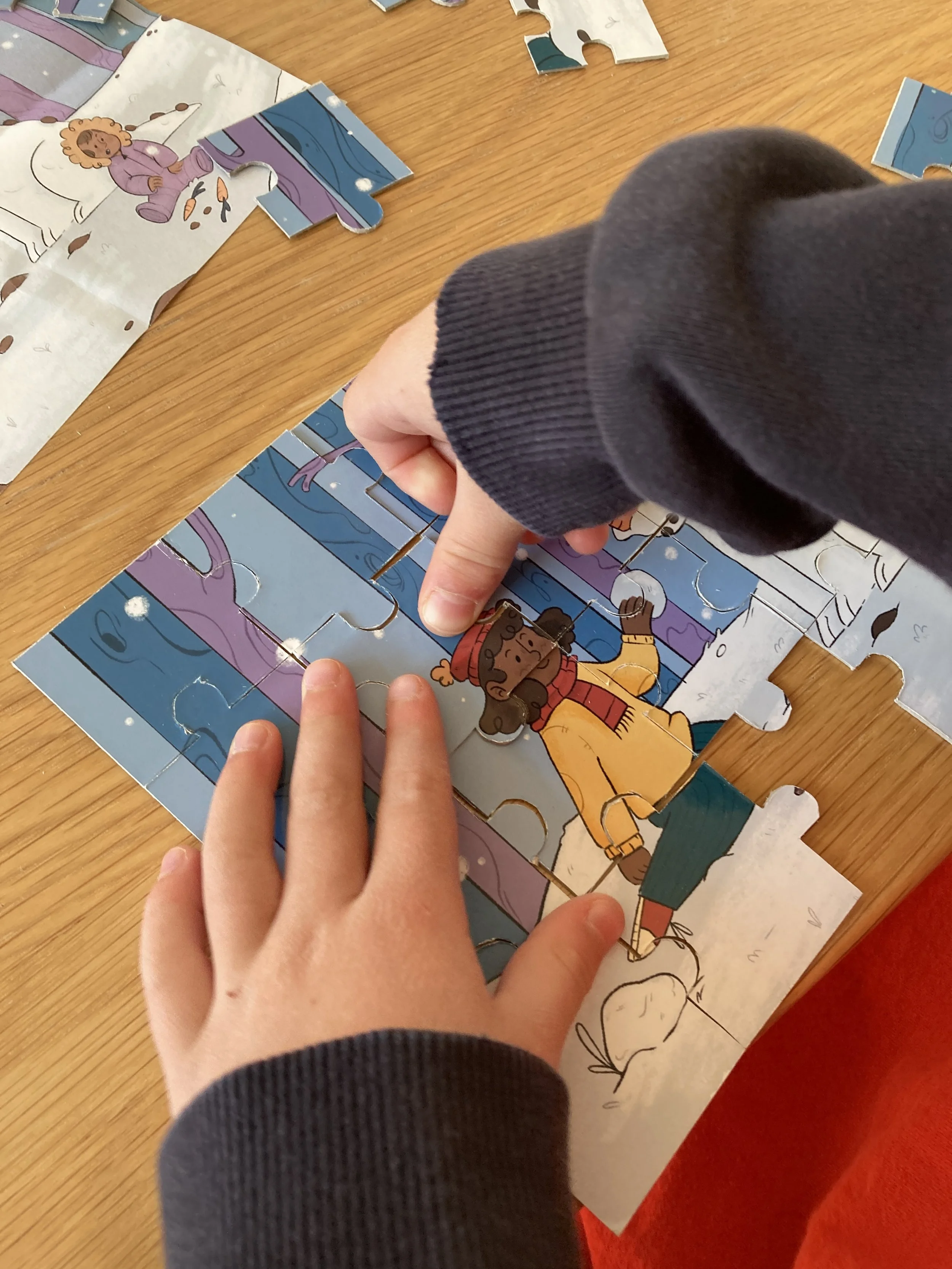 snow dino jigsaw puzzle Based on an illustrated story I was working on at the time, I illustrated a snowy scene which I ended up using to create a handmade puzzle using greyboard.